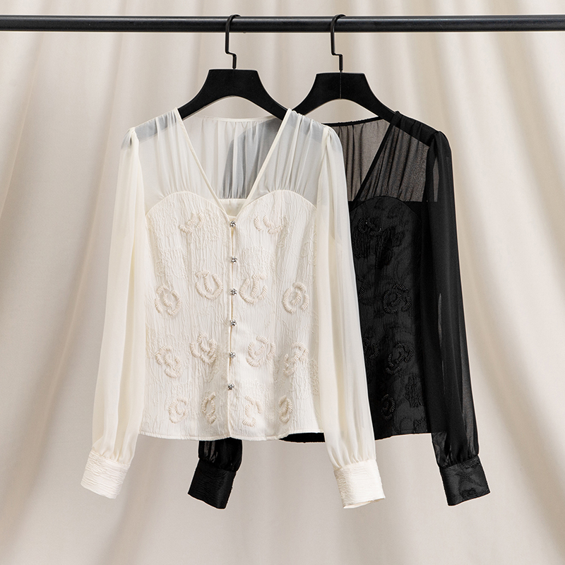 Bead Diamond Wrapped Chest V-neck Slightly Women Shirts Blouses And Tops Long Sleeve T Shirt For Women